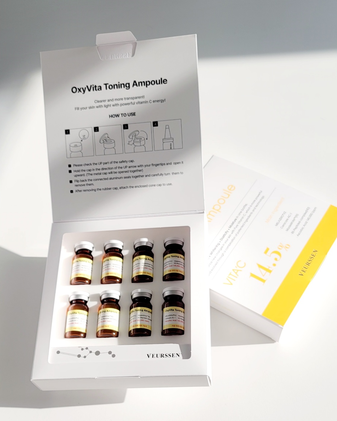 사실 토닝 앰플은 워낙 많아서 어떤 걸 골라야 할지 어려웠는데요, 저는 연아코스메틱의 베르센 순수비타민C 14.5% 옥시비타 토닝앰플 8mlx8EA 제품에 끌렸어요. 순수 비타민C 함량이 14.5%로 꽤 높은 편이라서 효과가 분명하다는 게 마음에 들었죠. 또 옥시비타라는 특허받은 성분 덕분인지 피부 톤정리와 칙칙함 개선에 좋은 것도 매력적이었답니다.
